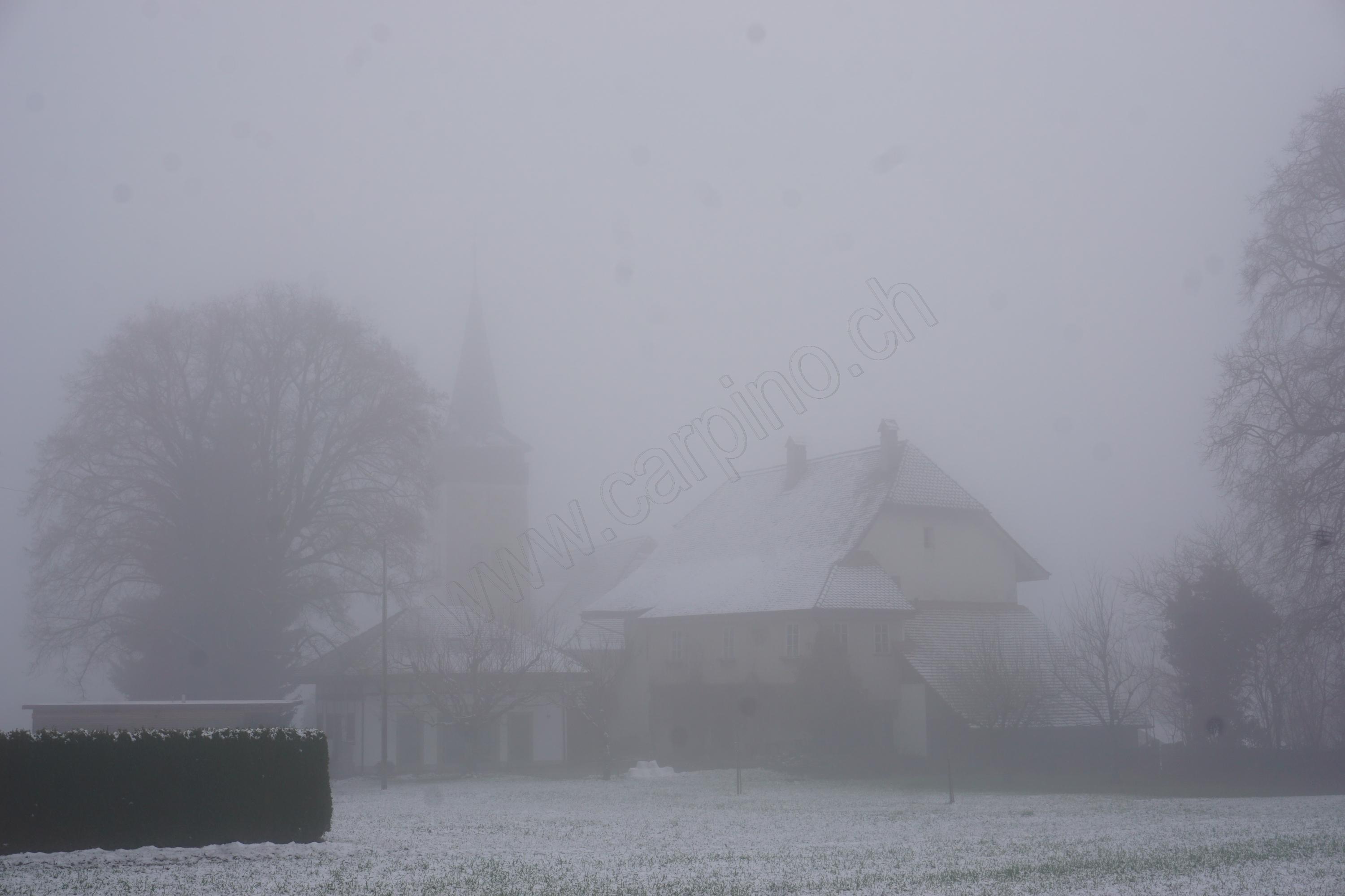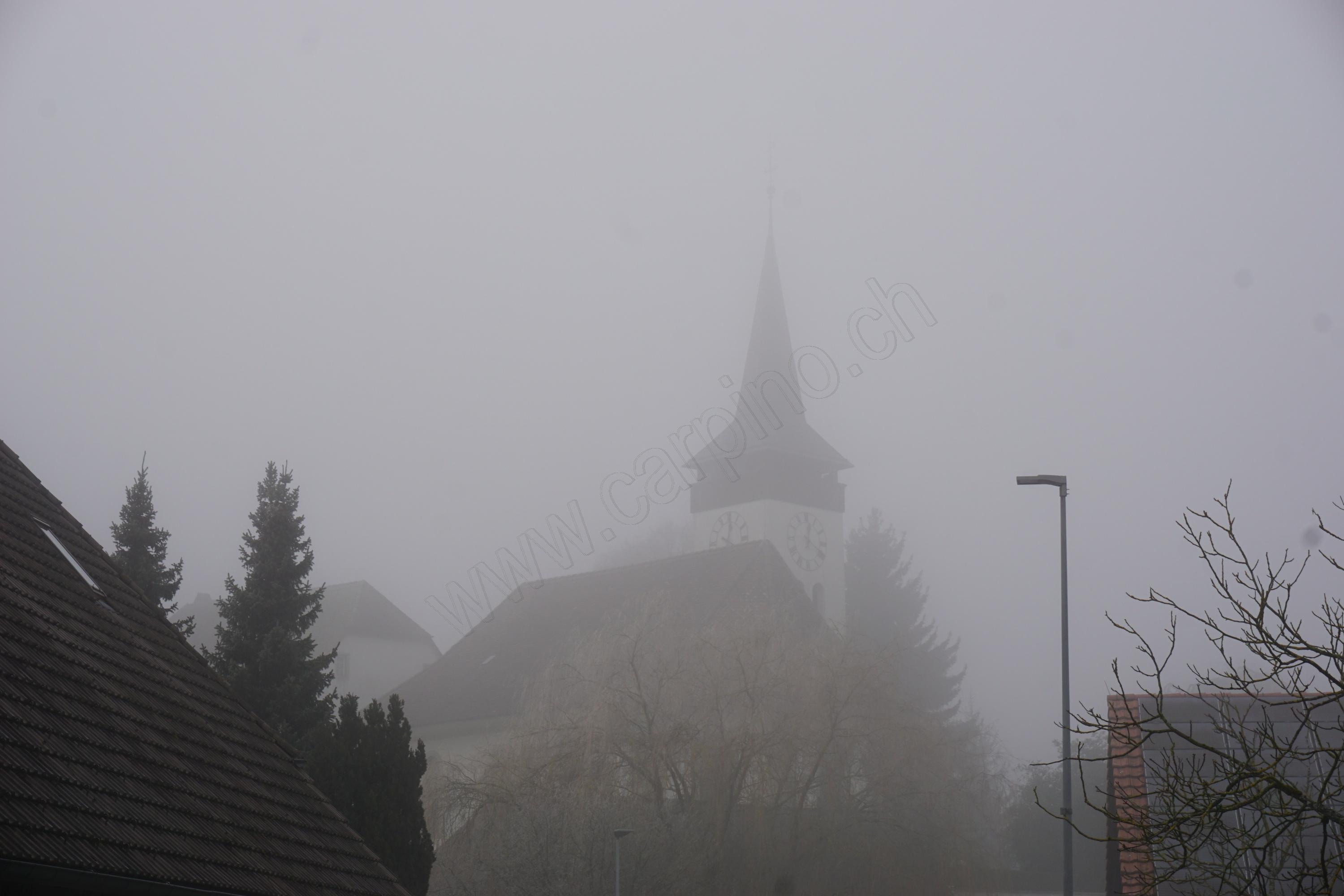 Kirche Thunstetten und Pfarrhaus im Nebel
